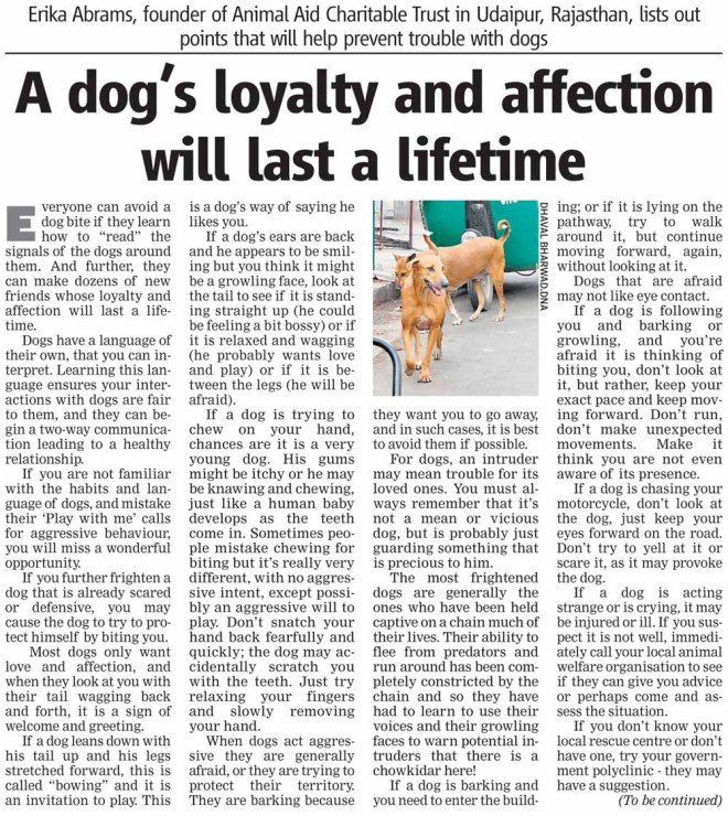 June 27, 2010 by "Jaagruti" How to behave with Dogs and understand them better? (Courtesy: DNA Ahmedabad 27th June 2010) An article by Erika Abrams about how to interact with dogs and read their signals… To read the second part of this article, please click here Share this: Click to share on Facebook (Opens in new window) Facebook Click to share on X (Opens in new window) X Click to email a link to a friend (Opens in new window) Email Click to share on LinkedIn (Opens in new window) LinkedIn Click to share on Tumblr (Opens in new window) Tumblr Click to share on Pinterest (Opens in new window) Pinterest Click to share on Pocket (Opens in new window) Pocket More Click to share on Reddit (Opens in new window) Reddit Click to print (Opens in new window) Print Like Loading... Related