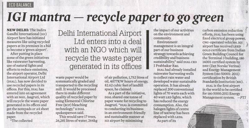 Delhi International Airport Limited’s Paper Recycling Initiative with ‘Jaagruti’ gets featured in the National Press on 2nd April, 2012