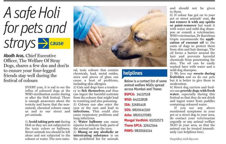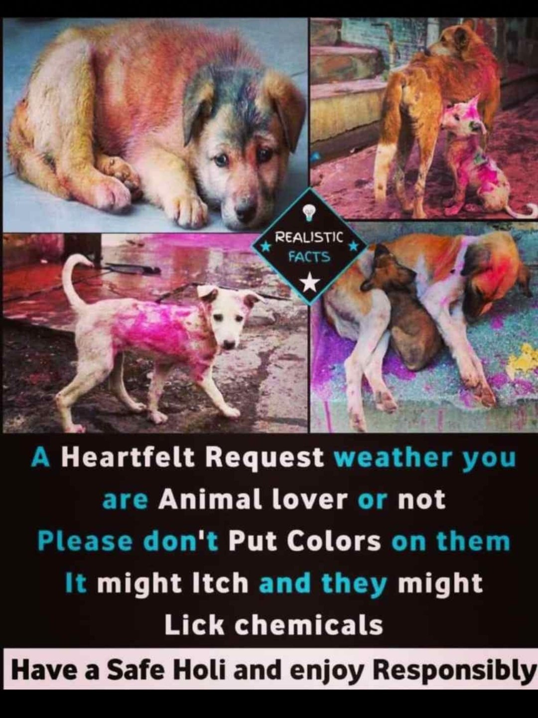Holi, the “Festival of Colours” is around the corner. As you play around and enjoy getting drenched in colours, please be mindful that the same may be very torturous and harassing for street animals.