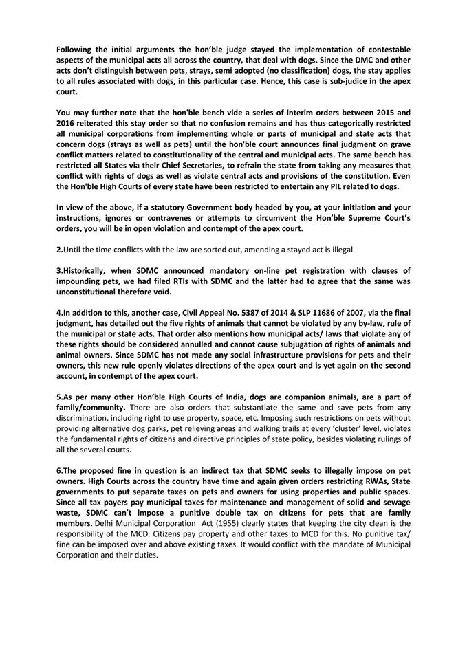 h)    You can also experiment with the creation of various pet defecation areas within community premises, which is what some housing societies and sectors are doing. These can be imaginatively spaced out within the precincts, and you can request pet owners to train their pets into using the same. You cannot however impose fines and special charges of any kind on pet owners, because there is no mandate in law for the same.