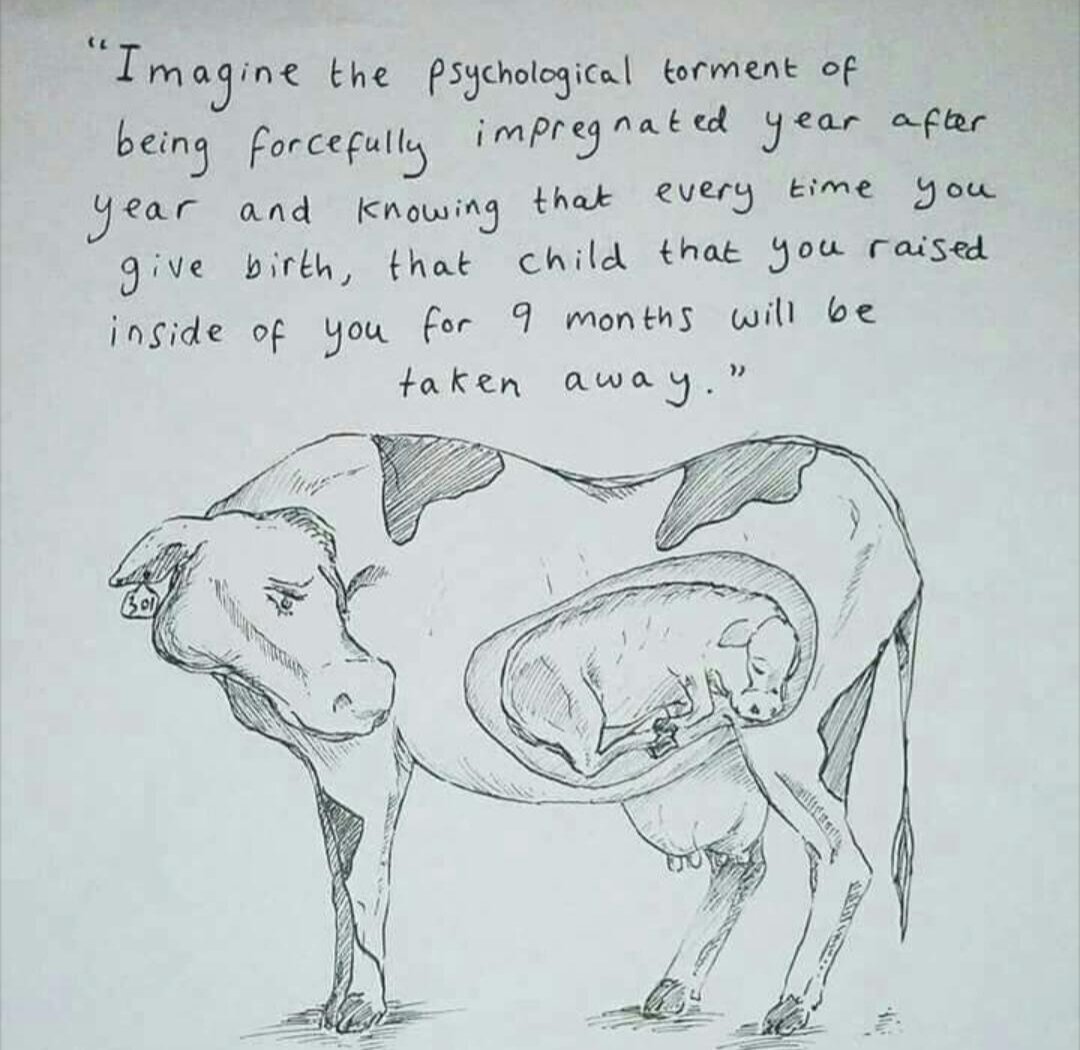 It doesn’t end with the cows, think of the calves which are starved off their mothers milk and male calves are just left to die or sold to the leather industry for their ‘Veal
