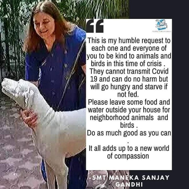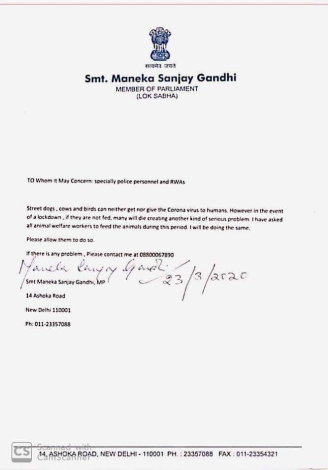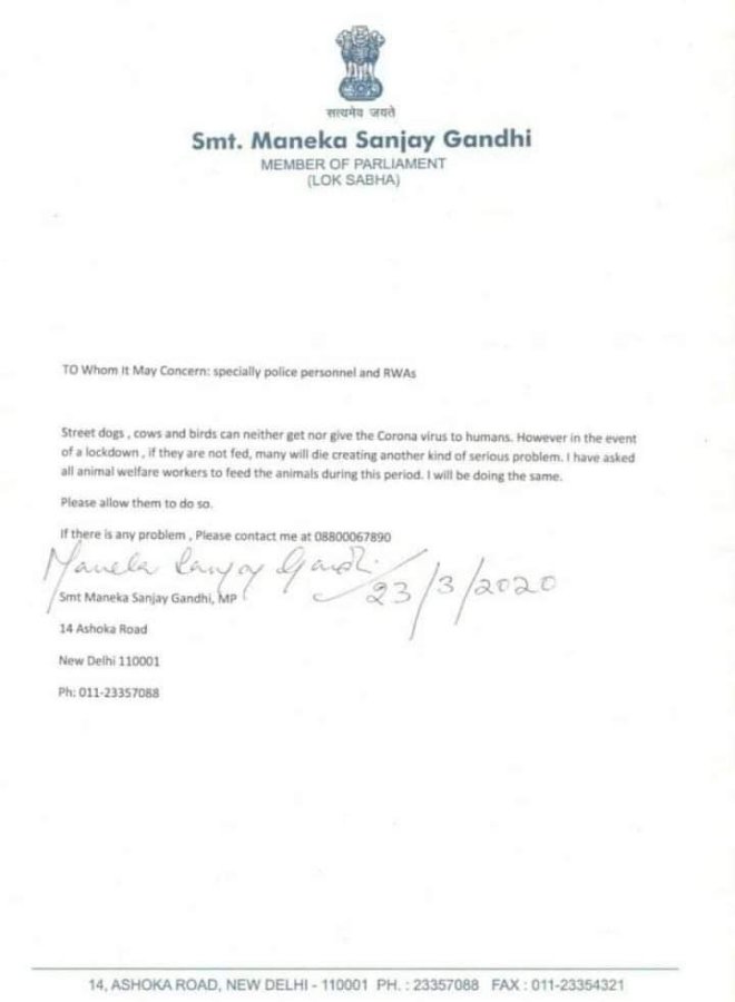 All Animal care takers and Feeders can keep this letter by Mrs. Maneka Gandhi, Honourable Member of Parliament (Lok Sabha, Government of India) handy in case they are stopped by authorities while feeding community animals.
