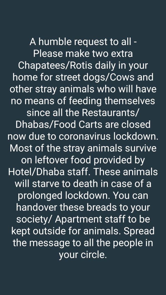 Please make two extra Chapatis/Rotis daily in your home for street dogs/Cows and other stray animals who will have no means of feeding themselves since all the Restaurants/Dhabas/Food Carts are closed now due to coronavirus lockdown.