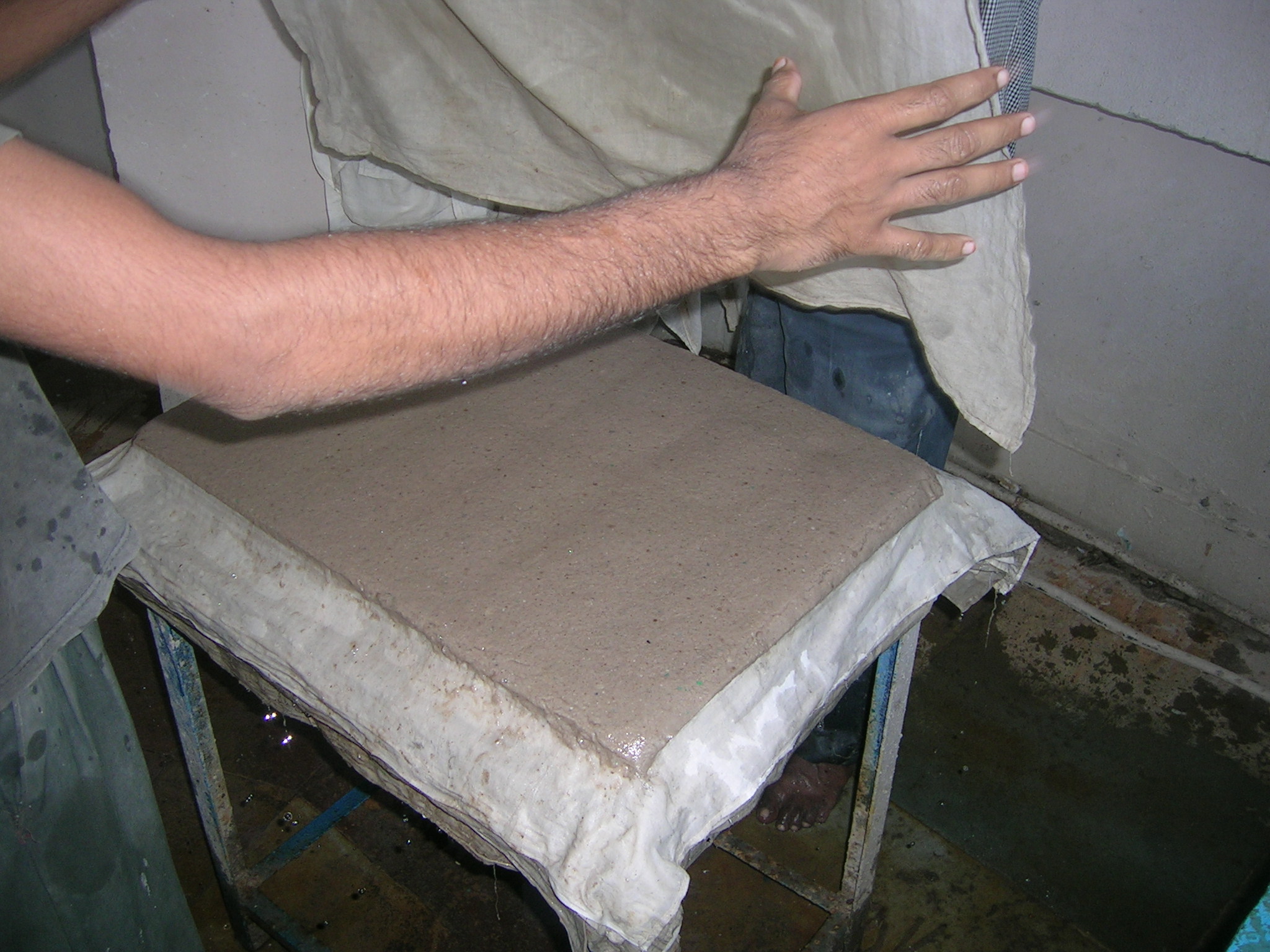 4. About 50 alternating sheets of wet paper pulp sheet and muslin cloth are placed in a ‘Screw Press’ and the water is drenched out completely.