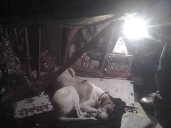 It was clicked at PVR Anupam-Saket, a multiplex in Delhi. In this small temple beneath a tree behind the multiplex where these two resident dogs with collars around their necks were sleeping peacefully, demonstrative of the relationship between GoD and DoG…